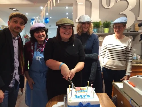 The BTRS Team at Headingley cutting the amazing Flat Cap Friday cake.
